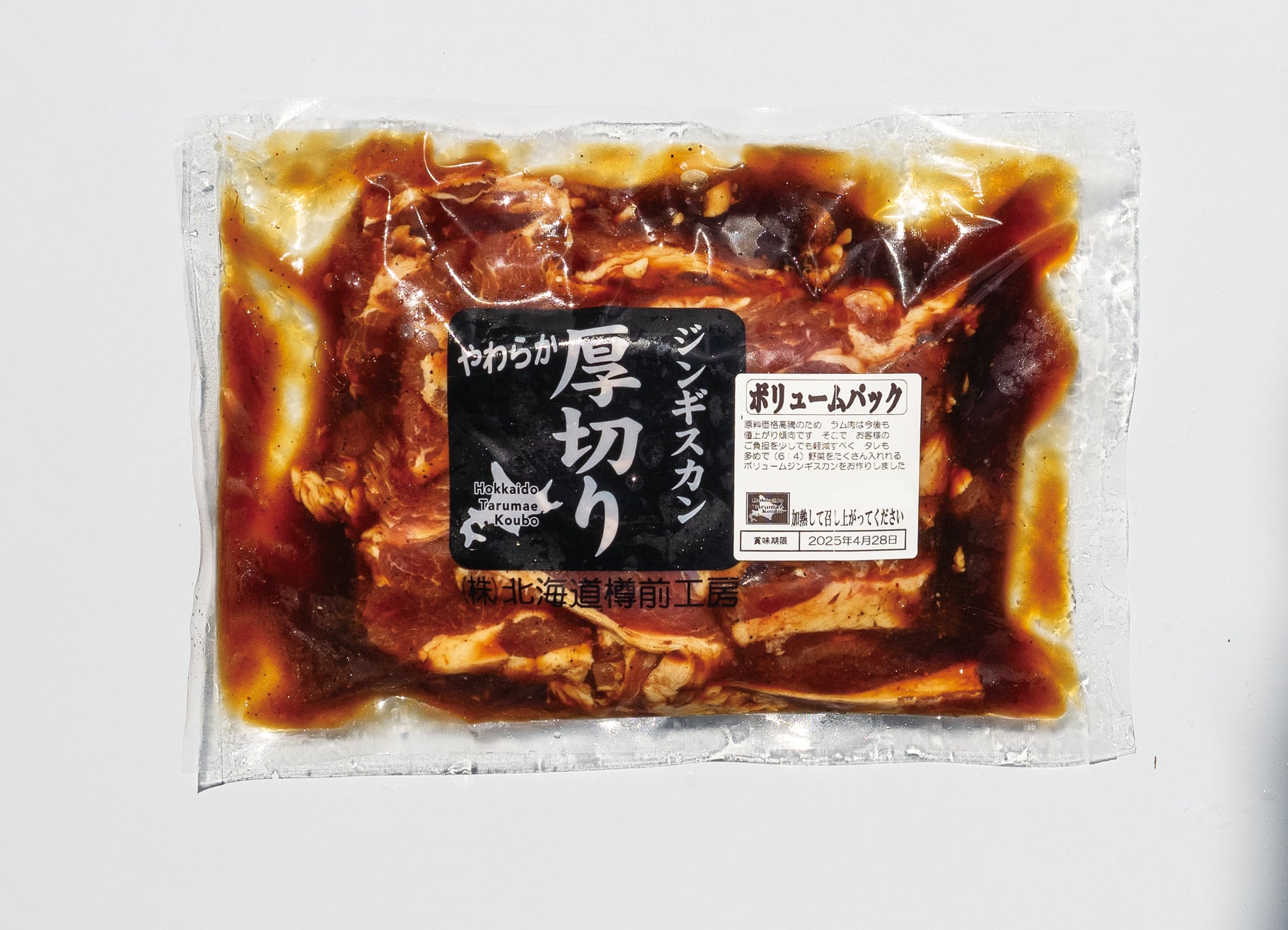 ラム肩肉を使用。やわらか加工した厚切り8㎜カットしたお肉をジンギスカンのたれに絡めました。6対4の割合でお野菜やうどんを入れて召し上がれます。